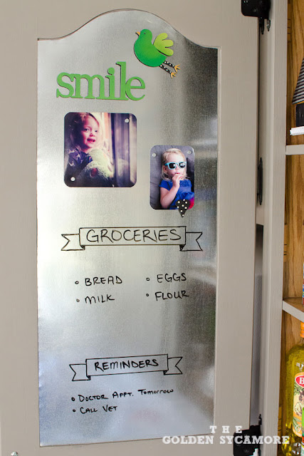 The Golden Sycamore combined the convenience of a dry erase board and a magnet board into one awesome command center inside her kitchen cabinet. Smart!