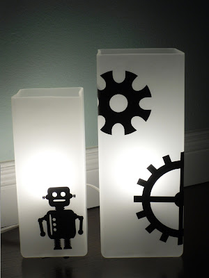 My Modish Mood embellished some IKEA lamps with vinyl. Any little boy would LOVE these robot lamps in their room.