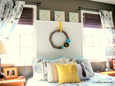 One of my favorite projects, so far, that still makes me smile every day is my headboard! We traded a friend a birthday cake for this leftover beadboard and other supplies and I made the wreath out of thrift store finds and other things I had laying around! I sewed the pillows out of napkins and other fabric scraps! The entire thing (headboard, pillows and wreath) came in at under $5. Holla!