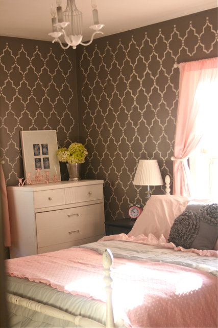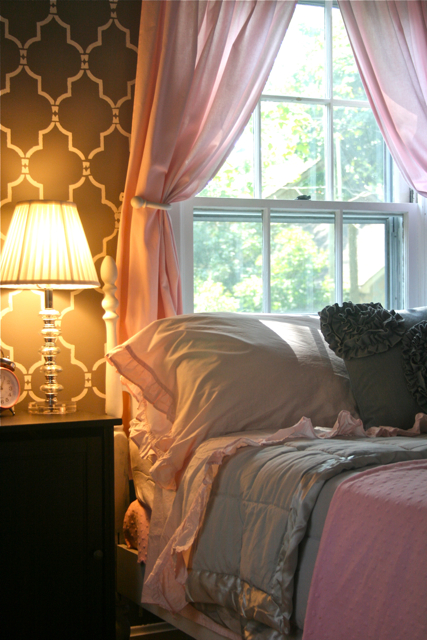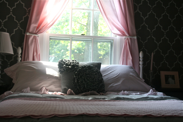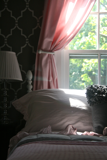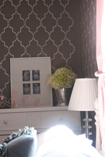 When I was looking at that first picture, I was thinking it was pretty but needed a bold gray and white graphic bolster or something. Then as I’m scrolling down, what I was envisioning for the room was all over the walls. It is perfect! Love, love.