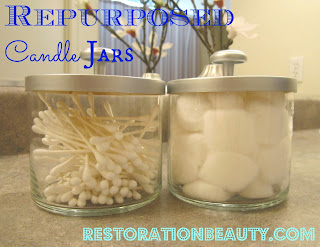 Restoration Beauty repurposed some candle jars into apothecary jars and they are fab.