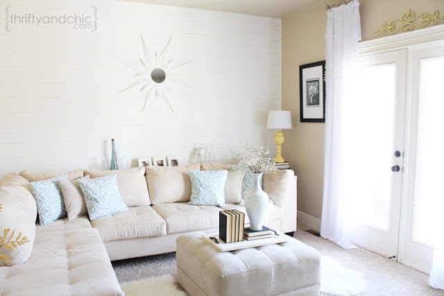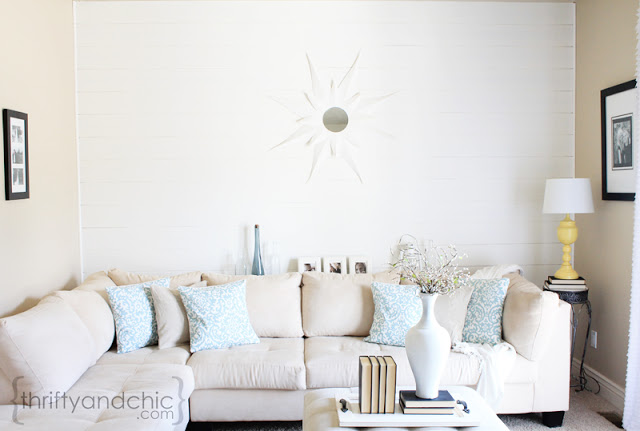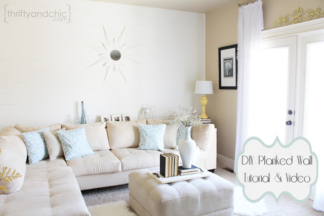 Today I am lucky enough to have one of my long time favorite blogs here, Thrifty & Chic! Alicia is not only beautiful, she is also a crazy good DIYer and builder. Her home is decorated so perfectly and is full of furniture that she made herself. Her post today is no different. She planked the wall in her living room and she is here to show it to you.